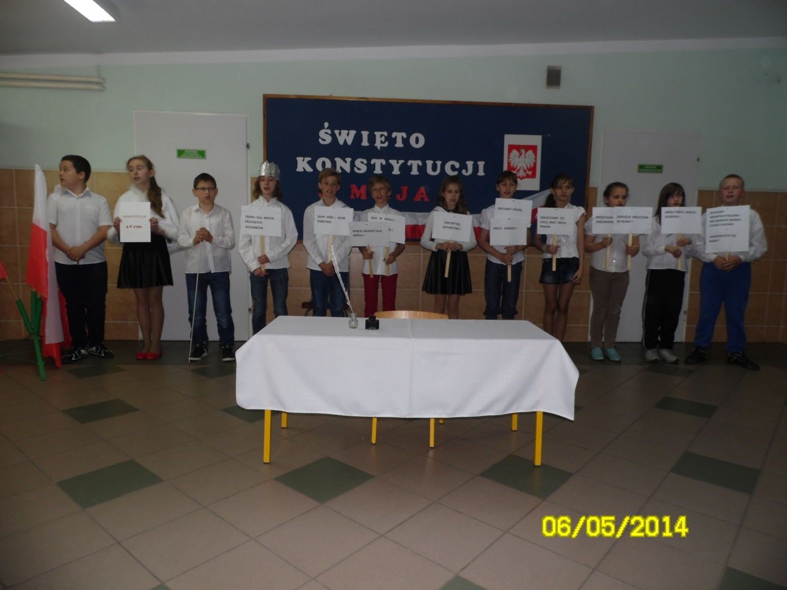 Uczniowie klasy piątej w wystawianej inscenizacji przedstawili skłóconych Polaków, którzy w obliczu grożącego państwu niebezpieczeństwa, potrafią dojść do porozumienia i uchwalają nową konstytucję. O wydarzeniach, w swoich dialogach, opowiadały postacie - Sprawiedliwość i Duch Stańczyka, które wprowadziły nas w XVIII wiek. Na scenie pojawiły się postacie historyczne: król - Stanisław August Poniatowski, marszałek Sejmu Wielkiego - Stanisław Małachowski, władcy Rosji, Prus i Austrii oraz przedstawiciele różnych grup społecznych.