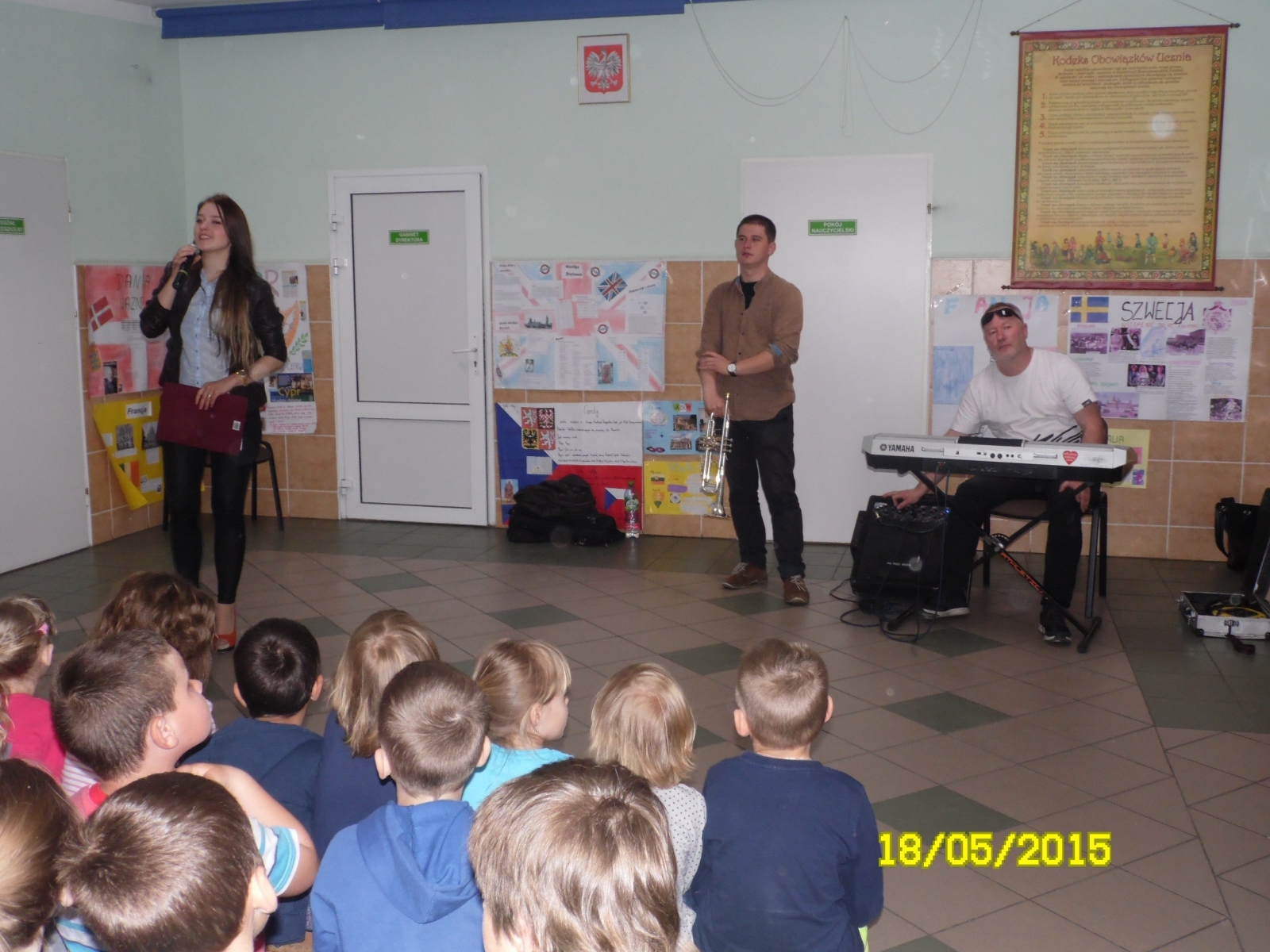 18 maja po raz kolejny mieliśmy okazję poznać nie tylko historię, wygląd, brzmienie czy krótką charakterystykę kolejnego instrumentu jakim jest trąbki, ale również wysłuchać utworów granych na tym najpopularniejszym instrumencie z rodziny dętych blaszanych. Utwory z dziedziny muzyki: klasycznej („Hiszpańska pchła”), folkowej („Wiśniowy sad”), filmowej(„Les Champs-Elysées”, „ Vabank”, „Hallelujah”), bajkowej („Gumisie”), religijnej („Amazing Grace”) i popularnej(„Serduszko puka w rytmie cza-cza”) porwały dzieci w wir zabawy i dobrego humoru, a zagadki muzyczne zaproponowane przez artystów aktywizowały ich do wspólnego śpiewu. Dało się zauważyć, że muzycy przekazują wiedzę w sposób prosty i przystępny, a wieloletnie doświadczenie pozwala im za każdym razem połączyć edukację z dobrą zabawą.