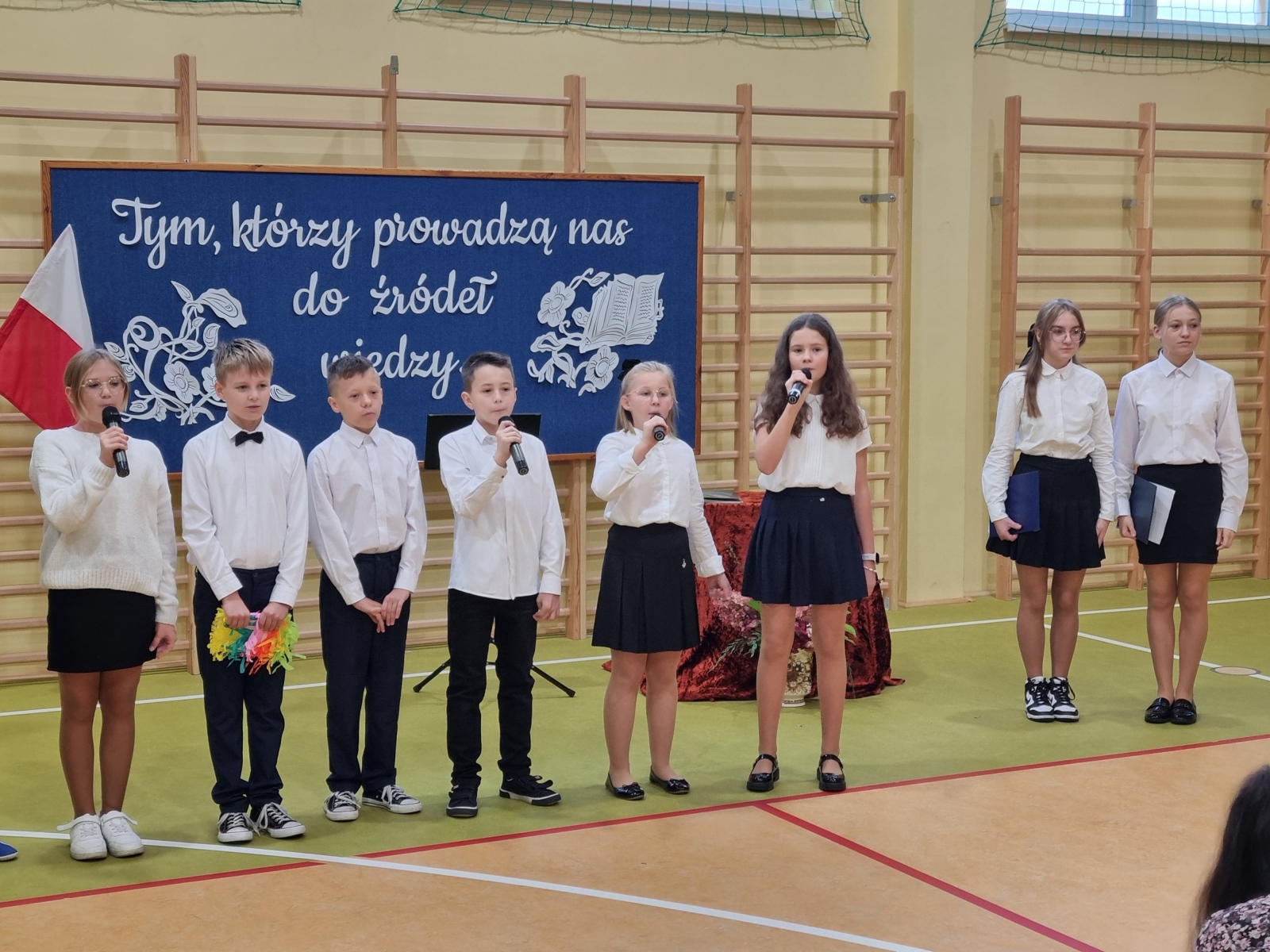 W Dniu Edukacji Narodowej, powszechnie znanym jako Dzień Nauczyciela, miłych akcentów w Szkole Podstawowej w Dziadowicach było wiele. Galowe stroje, symboliczne kwiaty w uczniowskich dłoniach zwiastowały atmosferę szkolnego święta. W ten wyjątkowy nastrój wprowadził Grono Pedagogiczne program artystyczny przedstawiony przez uczniów z klasy IV. Dzieci przedstawiły historię pewnego zeszytu, uświadamiając wszystkim, jak ważna jest możliwość chodzenia do szkoły i zdobywania wykształcenia. Jak pokazał finał historii, uczniowie zdają sobie dobrze sprawę z tego, że nauczyciele to ci, którzy prowadzą ich do źródeł wiedzy, a miarą kultury społeczeństwa jest szacunek okazywany stanowi nauczycielskiemu. Wyrazem tego szacunku były życzenia oraz nagrody wręczone przez Panią Dyrektor Emilię Stefaniak oraz Pana Wójta Ireneusza Augustyniaka. Na zakończenie akademii głos zabrała pani Dyrektor, która mówiła o trudnej, ale jakże pięknej pracy nauczyciela. Podziękowała za dotychczasowe zaangażowanie oraz życzyła wielu sił i wytrwałości w tym wyjątkowym zawodzie.