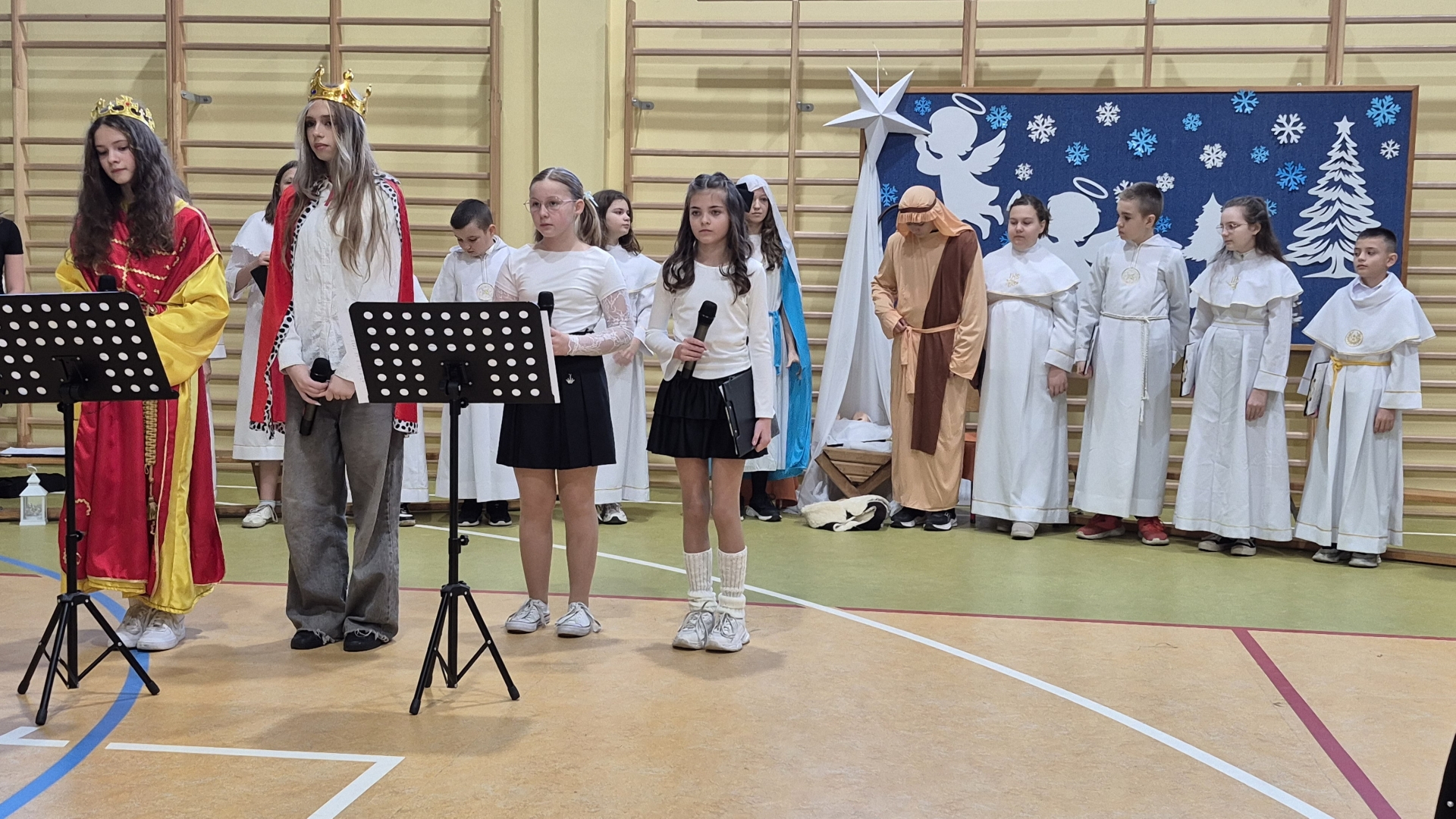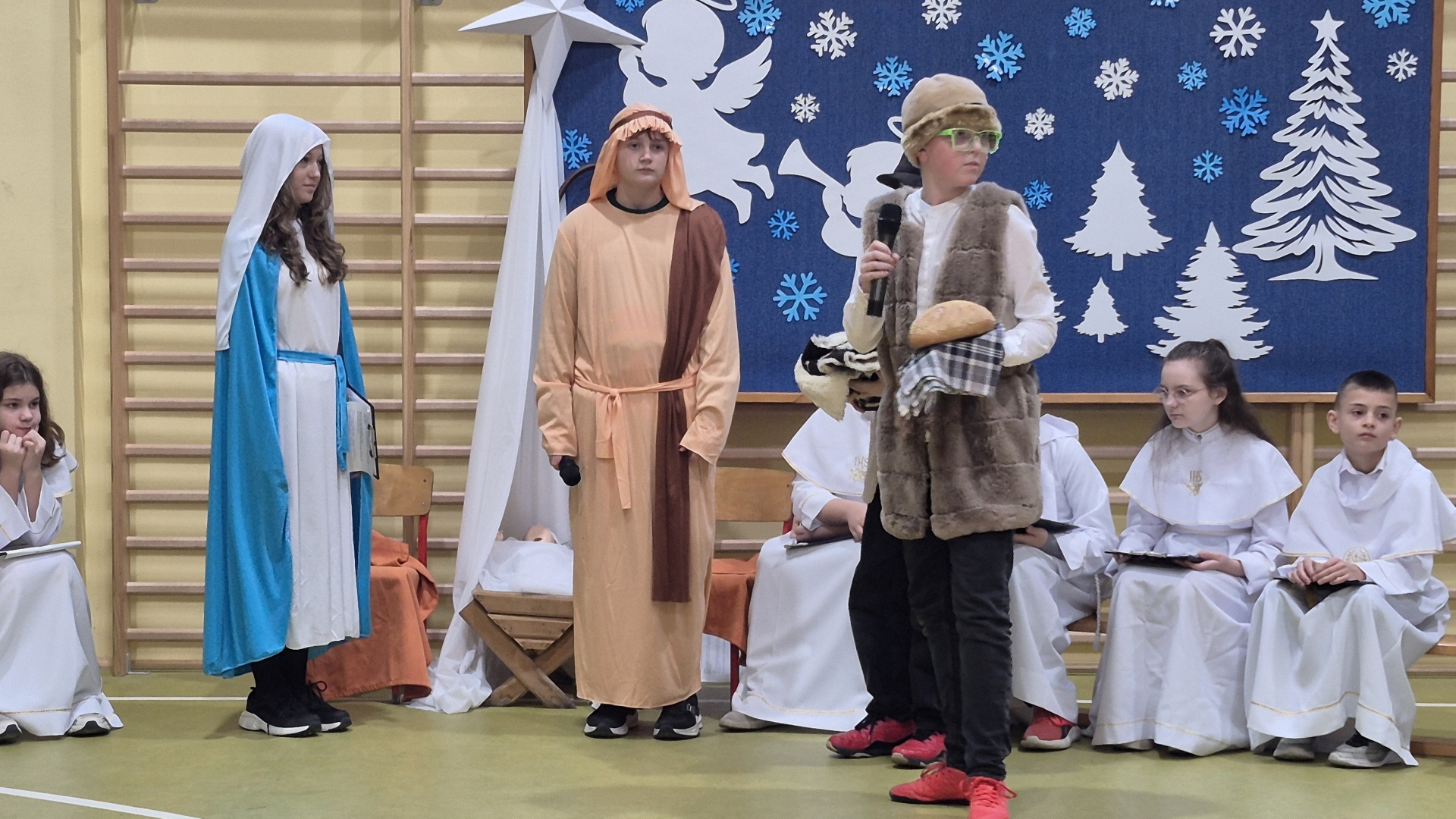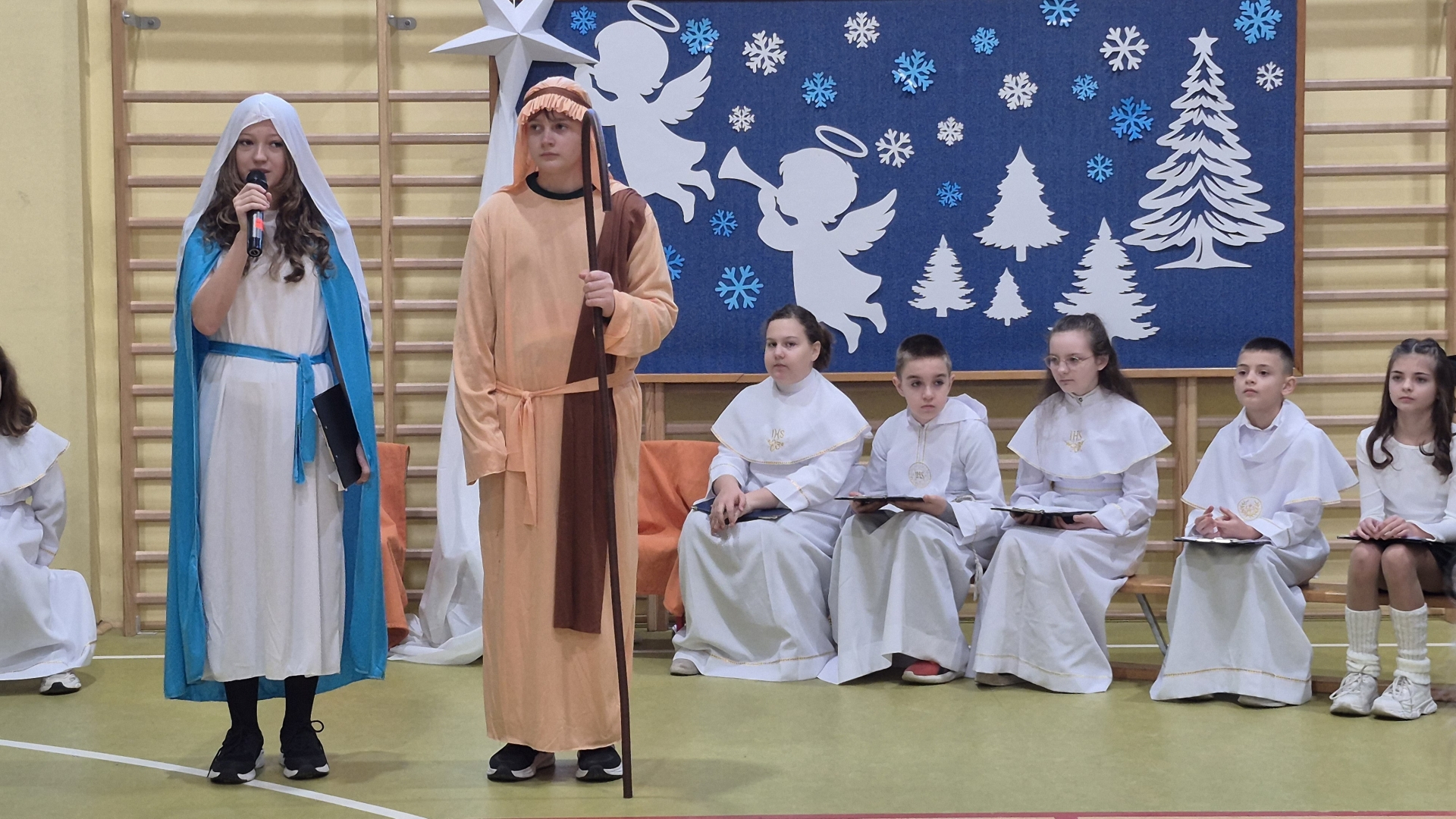 19 grudnia 2025 roku szkolni aktorzy świetnie i z ogromnym zaangażowaniem wcielili się w swoje role, przypominając w ten sposób wydarzenia sprzed ponad dwóch tysięcy lat, kiedy to w Betlejem narodziło się Boże Dzieciątko, łącząc tamte historyczne wydarzenia ze współczesnym czasem. Dzieci wcieliły się w role Maryi i Józefa, pasterzy, aniołów, trzech króli, postaci ze świata biznesu oraz dziecka, przybywających złożyć pokłon Jezusowi narodzonemu w ubogiej stajence. Świetności inscenizacji dodały pastorałki i kolędy, które napełniły wszystkich świąteczną radością i sprawiły, że poczuliśmy tę szczególną, świąteczną atmosferę.
