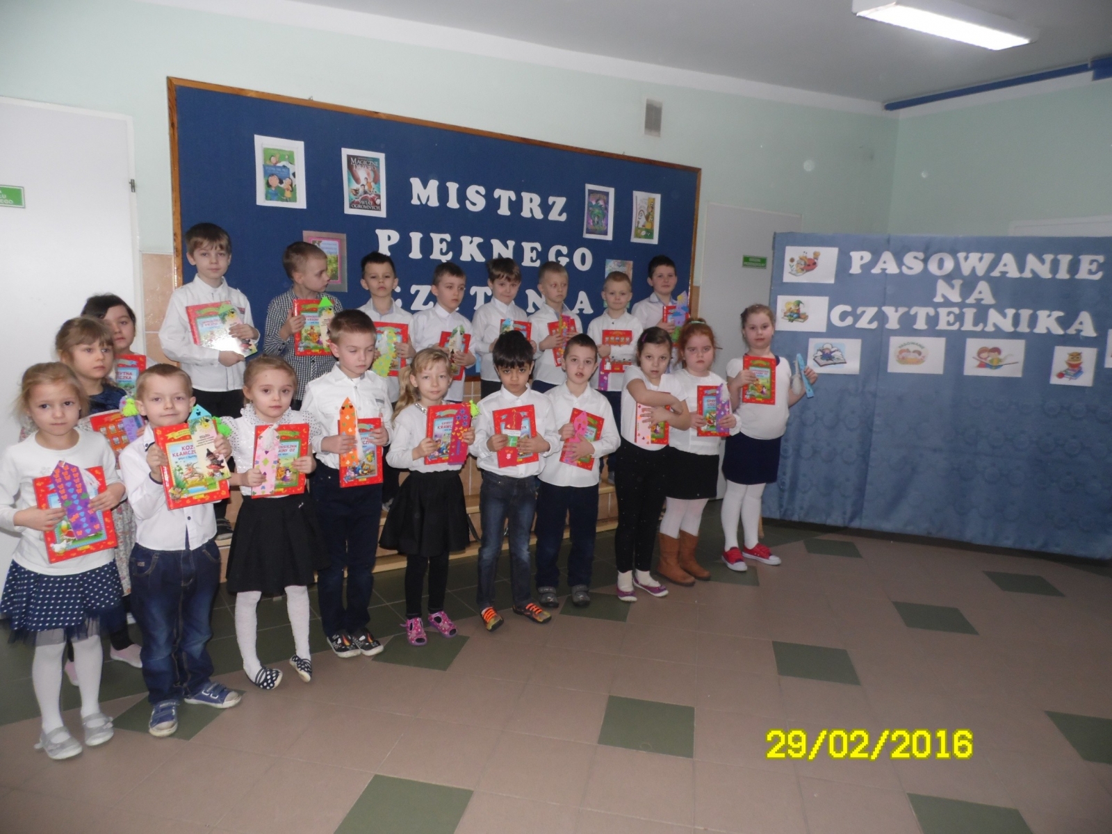 29 lutego 2016 roku był ważnym dniem dla uczniów klasy I Szkoły Podstawowej w Dziadowicach, w tym dniu bowiem odbyło się uroczyste „Pasowanie na czytelnika szkolnej biblioteki”. Organizator uroczystości, bibliotekarz – pani Lilla Herbich bardzo serdecznie powitała wszystkich zgromadzonych: Radę Rodziców, nauczycieli, uczniów klas starszych oraz bohaterów uroczystości czyli pierwszaków. Pani bibliotekarka zachęcała uczniów do jak najczęstszych wizyt w bibliotece szkolnej w której na nowych czytelników czeka wiele ciekawych bajek.