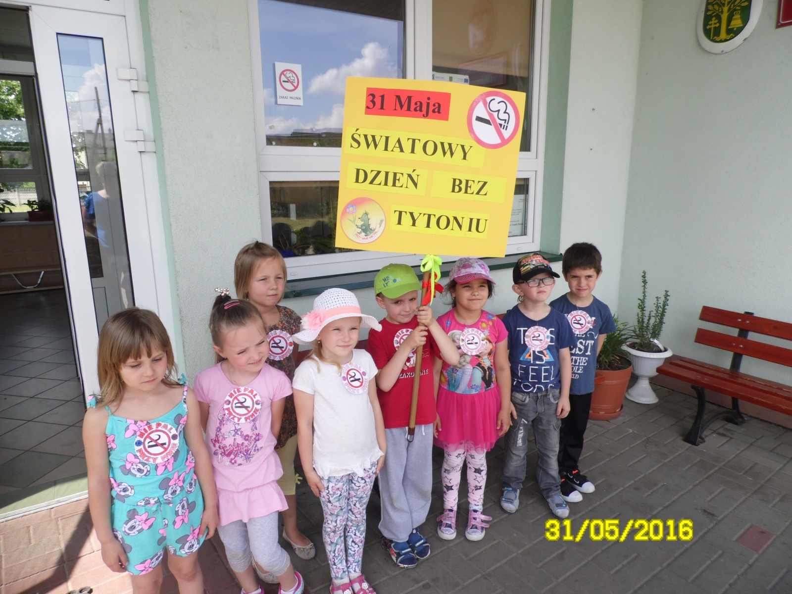 Światowy Dzień bez Tytoniu to akcja, którą zainicjowano na Konferencji WHO w roku 1988 w Madrycie. Każdego roku Światowa Organizacja Zdrowia stara się w tym dniu zwrócić uwagę na kwestię zdrowotnych, społecznych i ekonomicznych skutków palenia tytoniu. W dniu 31 maja dzieci z oddziału przedszkolnego SP w Dziadowicach uczestniczyły w zajęciach, na których mogły wykazać się zdobytą wiedzą na temat zagrożeń dla zdrowia związanych z paleniem tytoniu i przebywaniem w obecności osób palących oraz zagrożeń dla środowiska związanych z dymami przemysłowymi. Na zakończenie działań podsumowujących dzieci wybrały się na przemarsz z transparentem przypominającym o światowym dniu bez tytoniu.