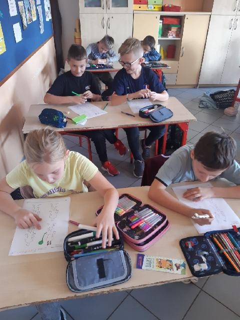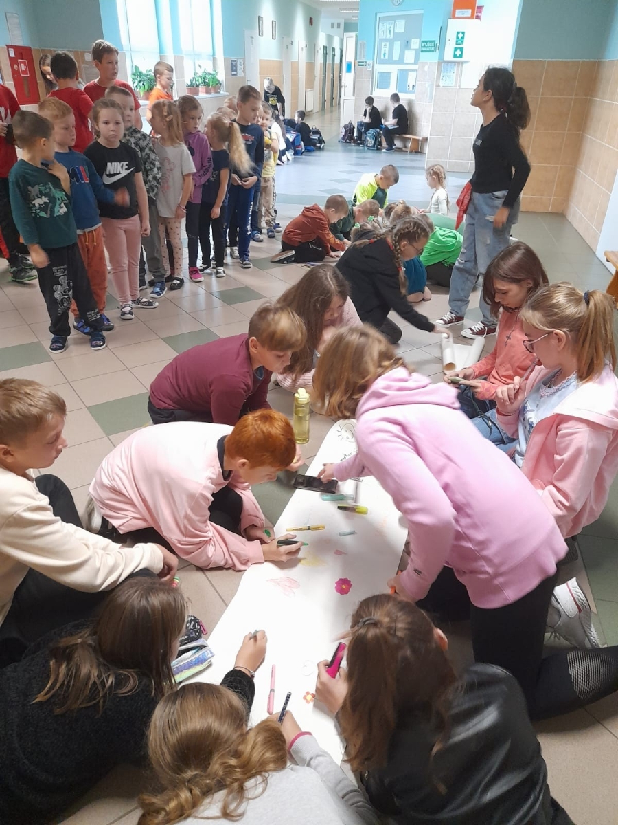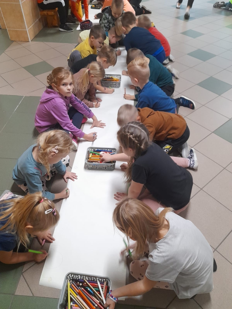 W środę królował dzień kolorów. Tego dnia uczniowie każdej klasy oraz dzieci z oddziału przedszkolnego założyli ubrania i gadżety w wylosowanym wcześniej kolorze. Natomiast podczas długiej przerwy wszyscy uczniowie rysowali na rolce papieru pozytywne hasła i emotki.
