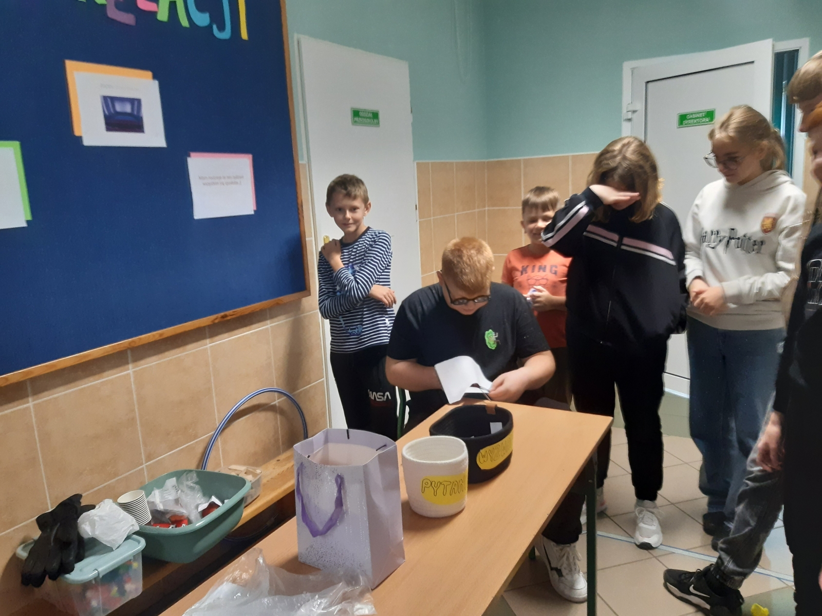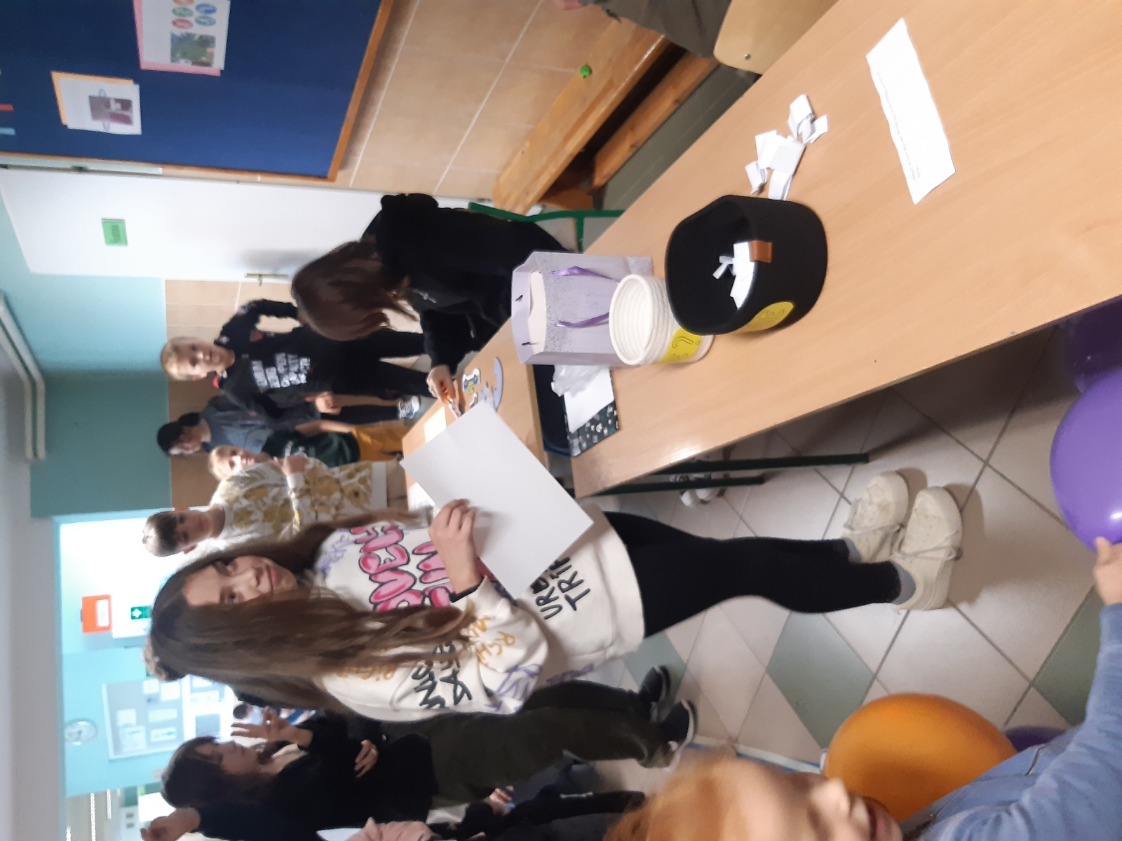Czwartek to dzień quizów. Uczniowie kl. 1- 8 próbowali swoich sił w konkursie „Zgadnij kto to?”. Klasy próbowały dopasować zdjęcia nauczycieli z dzieciństwa do ich właścicieli. Zadanie okazało się trudne, ale dzięki wzajemnej współpracy poradzili sobie doskonale, a dobry humor nikogo nie opuszczał. Podczas przerw uczniowie mogli też wziąć udział w „Wyzwaniu lub pytaniu”. Radosny nastrój towarzyszył wszystkim uczniom. Dzieci z oddziału przedszkolnego spróbowały za pomocą zmysłu dotyku odgadywać, jakie dary jesieni oraz przedmioty z kuchni zostały ukryte w pudełku.