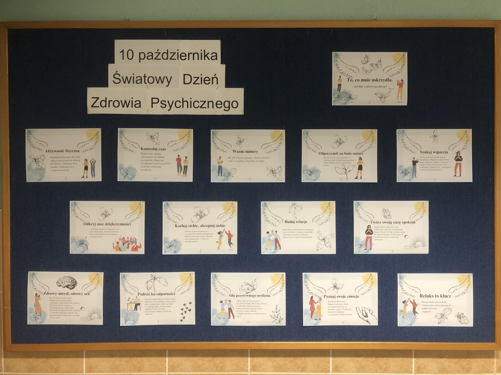 W związku ze Światowym Dniem Zdrowia Psychicznego powstała w naszej szkole również gazetka szkolna dotycząca sposobów dbania o zdrowie psychiczne oraz odbyły się zajęcia z psychologiem w oddziale przedszkolnym dotyczące zdrowia psychicznego - czym ono jest oraz jak możemy o nie dbać.