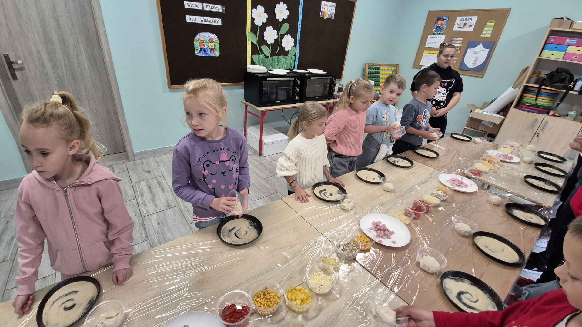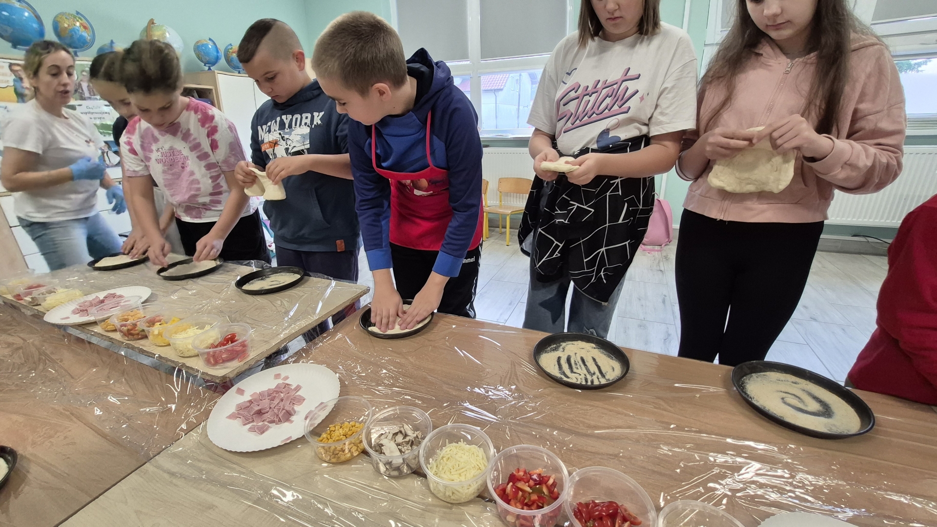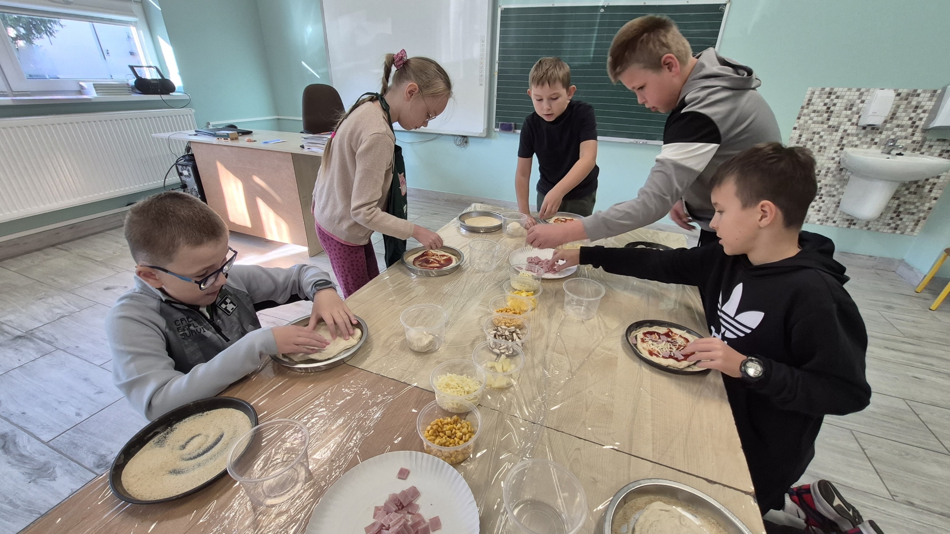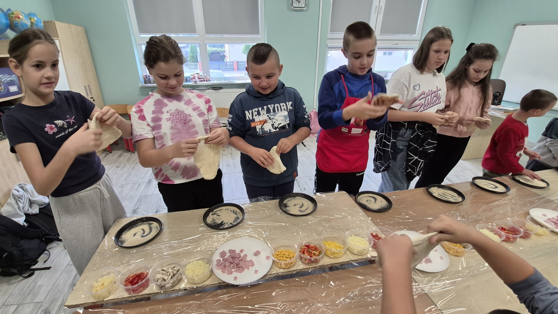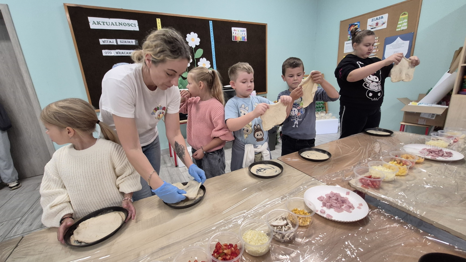 W czwartek 2 października dzieci z oddziału przedszkolnego oraz klasy I, III i IV uczestniczyły w warsztatach robienia pizzy. Na początku pani prowadząca powiedziała uczniom jakie składniki są potrzebne by wykonać dobrą pizzę. Podczas warsztatów dzieci samodzielnie formowały ciasto, nakładały sos pomidorowy, a następnie dobierały swoje ulubione dodatki. Każdy uczeń miał szansę stworzyć swoją ulubioną pizzę według własnego pomysłu.
