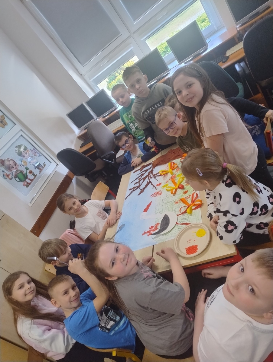 Główną częścią warsztatów była aktywność plastyczna. Uczniowie klasy I wykonali piękne, wiosenne bukiety z wykorzystaniem wytłaczanek, farb i plasteliny. Natomiast uczniowie klas II i III stworzyli wspólną, klasową pracę – wiosenną łąkę. Dzieci wykorzystywały różnorodne materiały o zróżnicowanych fakturach, rozwijając tym samym swoje zmysły i kreatywność. W pracy pojawiły się m.in. kolorowe motyle wykonane z pomalowanego makaronu, popcorn jako białe kwiaty na drzewach, kwiaty na łące tworzone techniką odciskania widelca w farbie, a także hiacynty wykonane przy użyciu patyczków higienicznych.