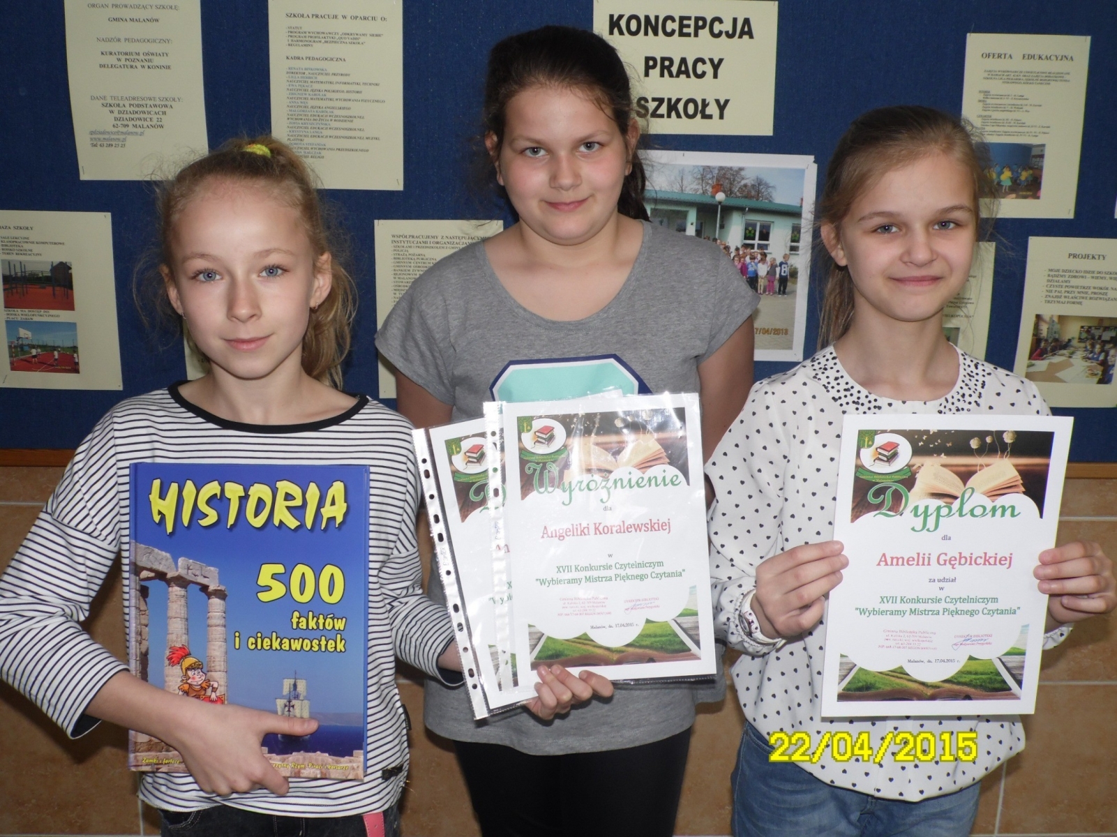 Uczennice kl. IV: Amelia Gębicka, Angelika Koralewska i Marcelina Śmiglewska reprezentowały naszą szkołę w konkursie czytelniczym ‘Wybieramy Mistrza Pięknego Czytania”, którego organizatorem była Gminna Biblioteka Publiczna w Malanowie. Konkurs przeznaczony był dla uczniów klas czwartych szkól podstawowych naszej gminy i odbył się 17. 04. 2015 r. w Świetlicy Wiejskiej w Malanowie.