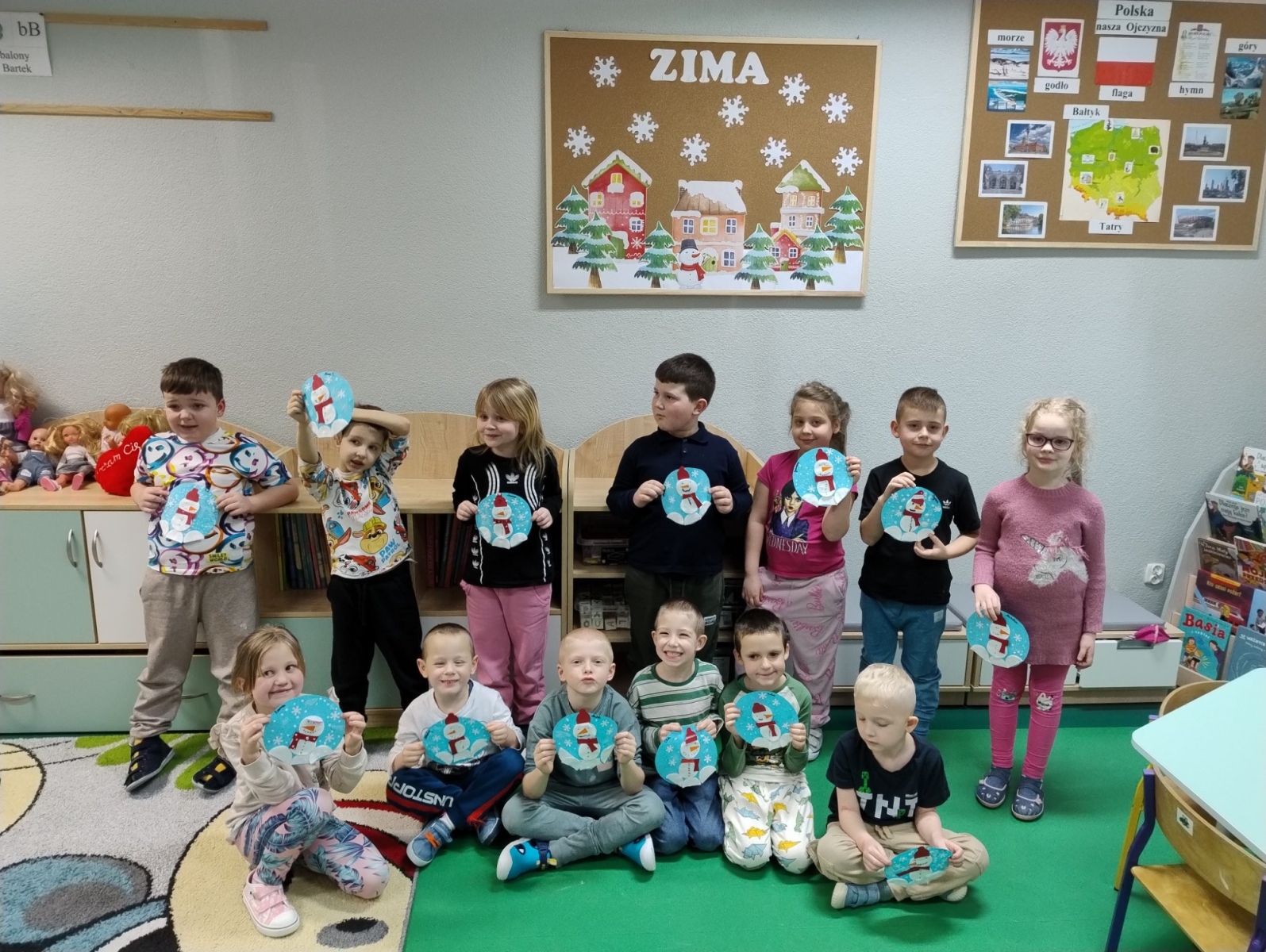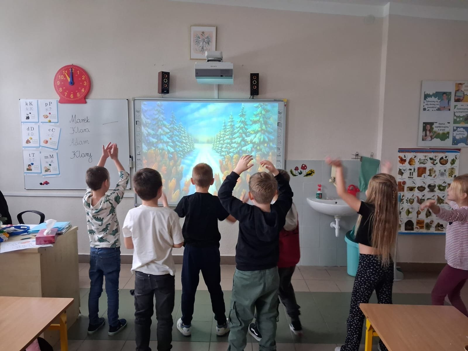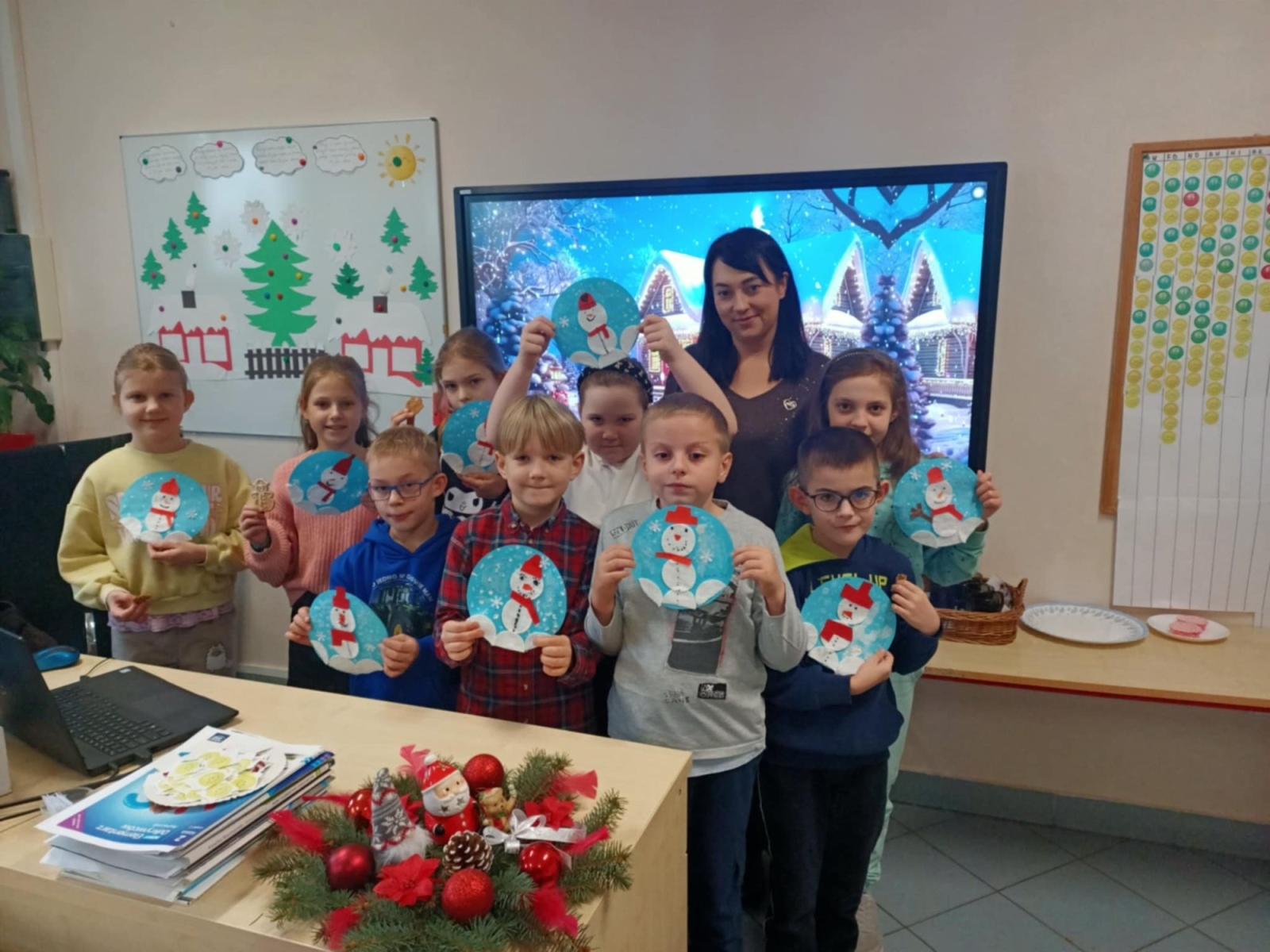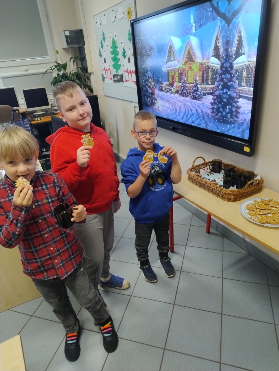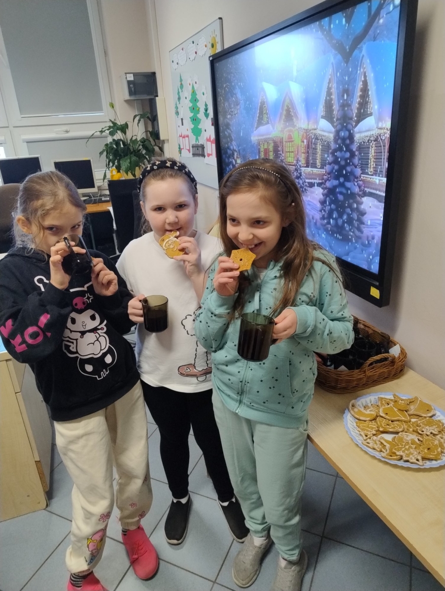 Uzupełnieniem zajęć były piosenki ruchowe z elementami pokazywania, które sprzyjały regulacji emocji , integracji zespołu klasowego oraz aktywności ruchowej. Warsztaty zakończyły się wspólnym zimowym poczęstunkiem- pierniczkami oraz ciepłą herbatą- wprowadzając dzieci w miłą, spokojną i bezpieczną atmosferę.