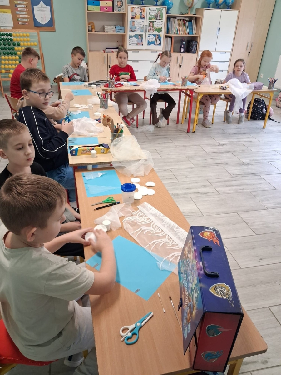 W okresie zimowym, na przełomie grudnia i stycznia, w klasach 0-3 naszej szkoły odbył się cykl interdyscyplinarnych zimowych warsztatów terapeutycznych w ramach projektu ,,Rok dziecięcej kreatywności’’. Zajęcia miały na celu wspieranie rozwoju sensorycznego, emocjonalnego i społecznego uczniów, a także wzmacnianie koncentracji, koordynacji wzrokowo-ruchowej oraz umiejętności współpracy w grupie.